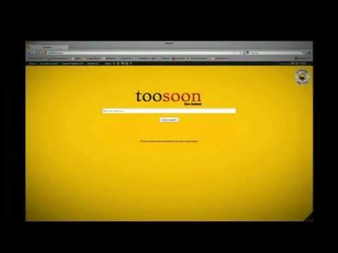 "Toosoon was created by a team of stand-up comedians and sit-down mathematicians for The New Zealand International Comedy Festival. This search engine was commissioned to calculate when a topic is too soon to joke about. All results are processed realtime, according to impartial online conversations. Within the search engine is an algorithm that samples the mood of online conversations, then predicts the approximate date the public will find that topic funny."